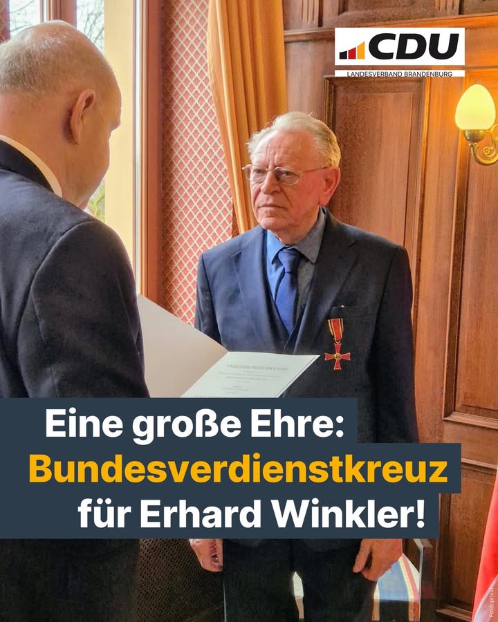 Unser CDU-Mitglied Erhard Winkler aus Falkensee wurde mit dem Verdienstkreuz am Bande des Verdienstordens der Bundesrepublik Deutschland ausgezeichnet.Landrat Roger Lewandowski (CDU) überreichte die Ehrung im Rahmen einer Feierstunde auf Schloss Ribbeck.Seit Jahrzehnten engagiert sich Erhard Winkler für die Anliegen älterer Menschen. Herzlichen Glückwunsch und vielen Dank für diesen besonderen Einsatz! 🇩🇪
